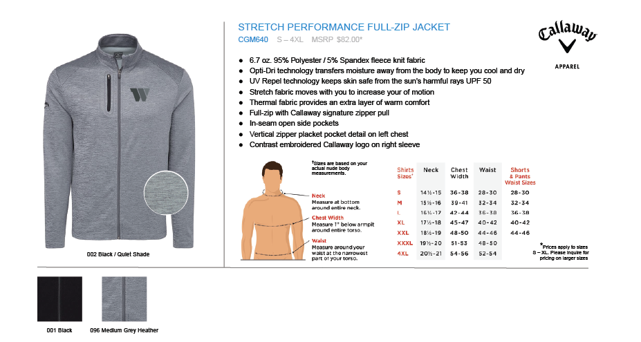 Vertical zipper placket pocket detail on left chest. Contrast embroidered Callaway logo on right sleeve.